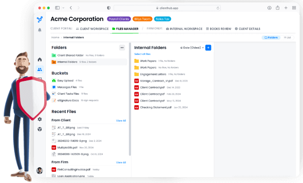 Client Hub prioritizes data security for accounting practices at every step. All information is encrypted in transit and at rest, stored on Google Cloud and Amazon Web Services, and monitored constantly. You can also enable MFA and keep data segmented by role-based permissions.